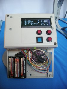 Sfrutta un sensore magnetico e un magnete attaccato sulla ruota e calcola in base alla circonferenza della ruota la velocità della bici. Calcola anche la lunghezza del tragitto percorso e l’ora grazie all’Arduino lilypad, indica la carica della batteria e la temperatura sfruttando il sensore integrato nell’Atmega328. Ho usato un Arduino Lilypad (ricevuto in regalo) e uno Sparkfun SerLCD v2.5, tre pulsanti NO collegati a 3 ingressi di Arduino che chiudono a massa e un interruttore di ON/OFF sulla batteria, la batteria è composta da 3xAA, l’Arduino ricava dalla tensione in ingresso il livello di carica della batteria e sfruttando i caratteri custom dell’HD44780 ne mostra il livello sull’LCD. Il contatore dei chilometri percorsi può essere resettato utilizzando il menù del sistema, da cui è anche possibile configurare l’ora.